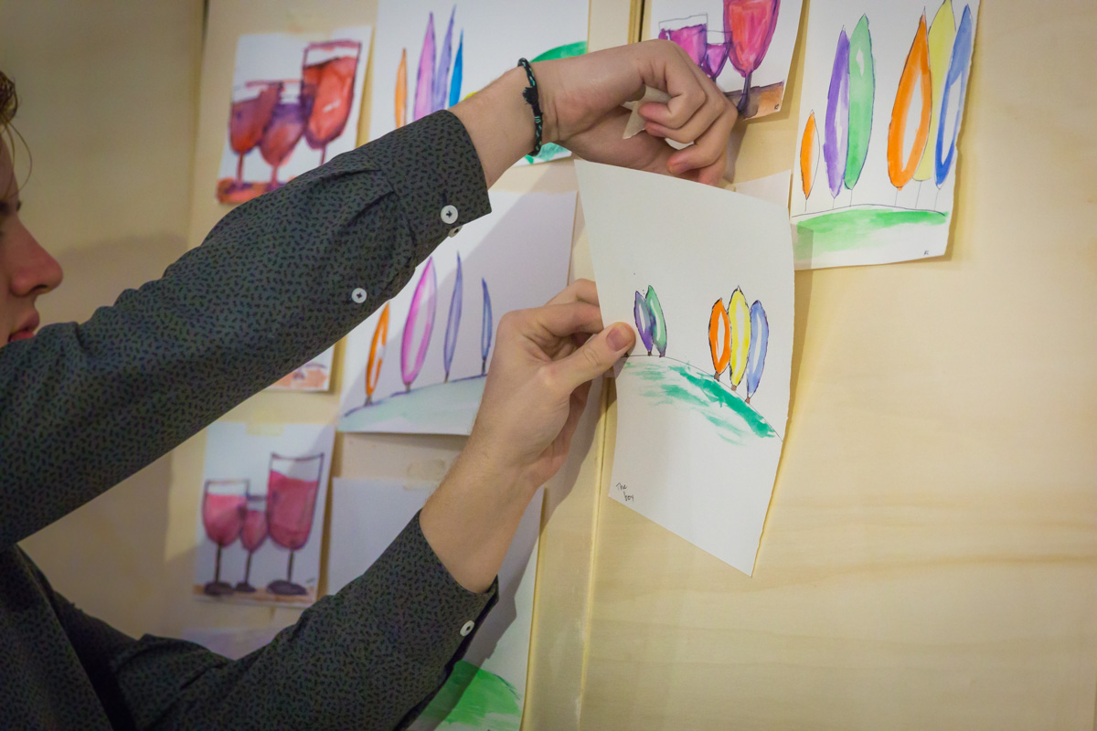 One of the principle ideas in a master class like this is to make the students learn how to collaborate with each other, how to learn from each other and make a great opera multiple hands on work. So on, the Iguarnieri artists showed and guided the students into the incision layer and color application when our main material, the plaster, was still fresh. So our purpose for this lesson was to create a three different landscapes, cypresses, flowers and sail boats, all together, incisions and coloring the students jumped from a painting to another, creating a splashing mashup of colors and art.