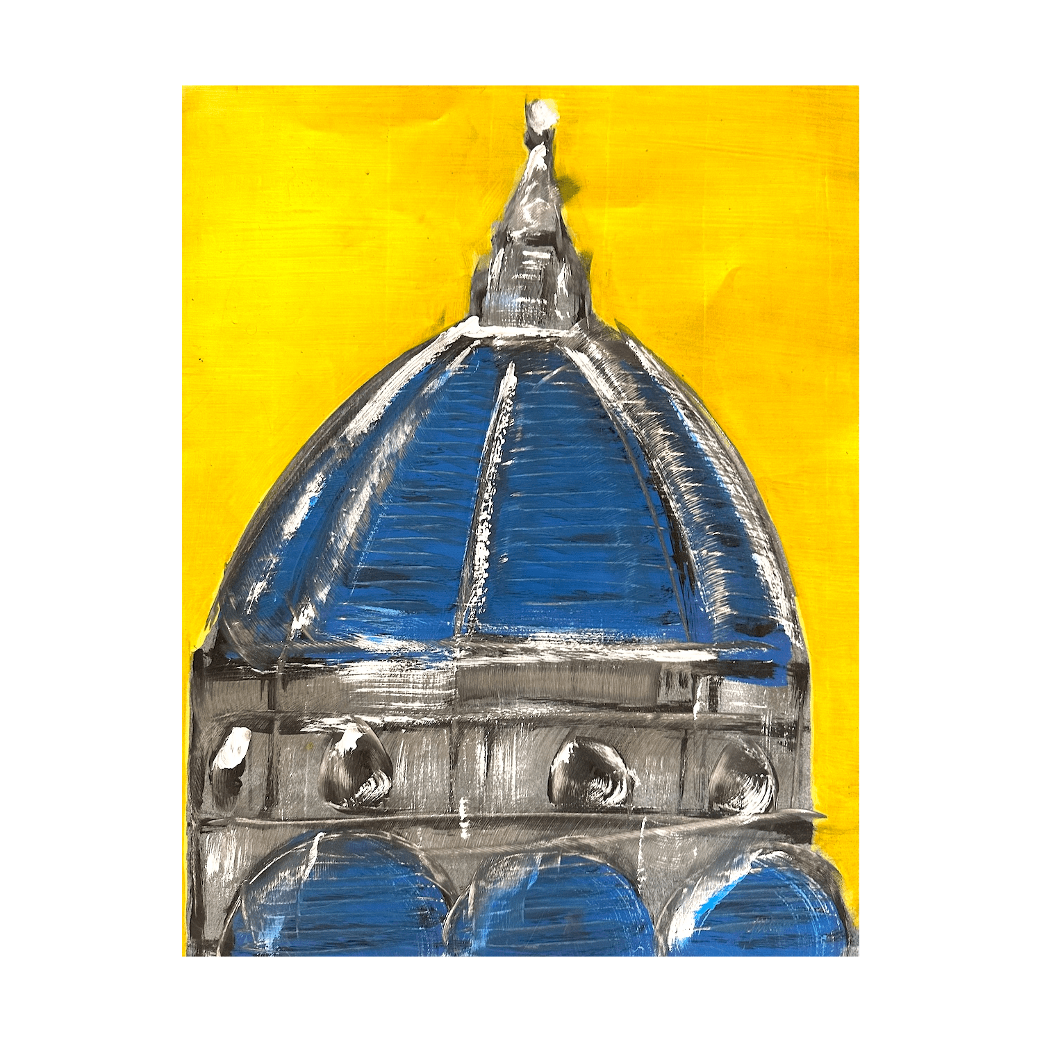 Blue Dome in Yellow is a contemporary artwork inspired by the Cathedral of Florence, where the iconic dome stands out in deep blue against a vibrant yellow background.