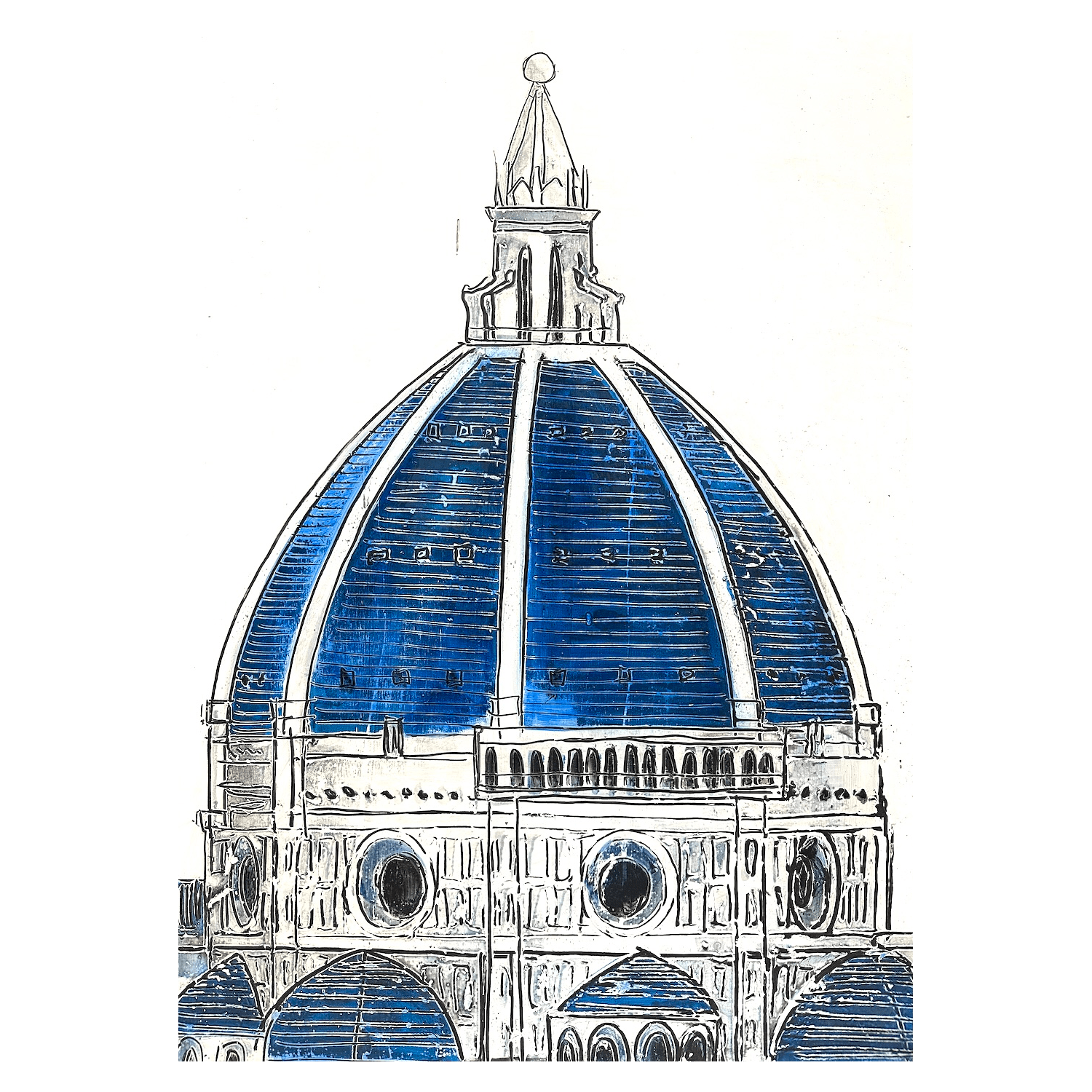 Defined by clean lines and a white background, the composition highlights the architectural purity of Brunelleschi’s dome, transforming it into a timeless and recognisable contemporary symbol.