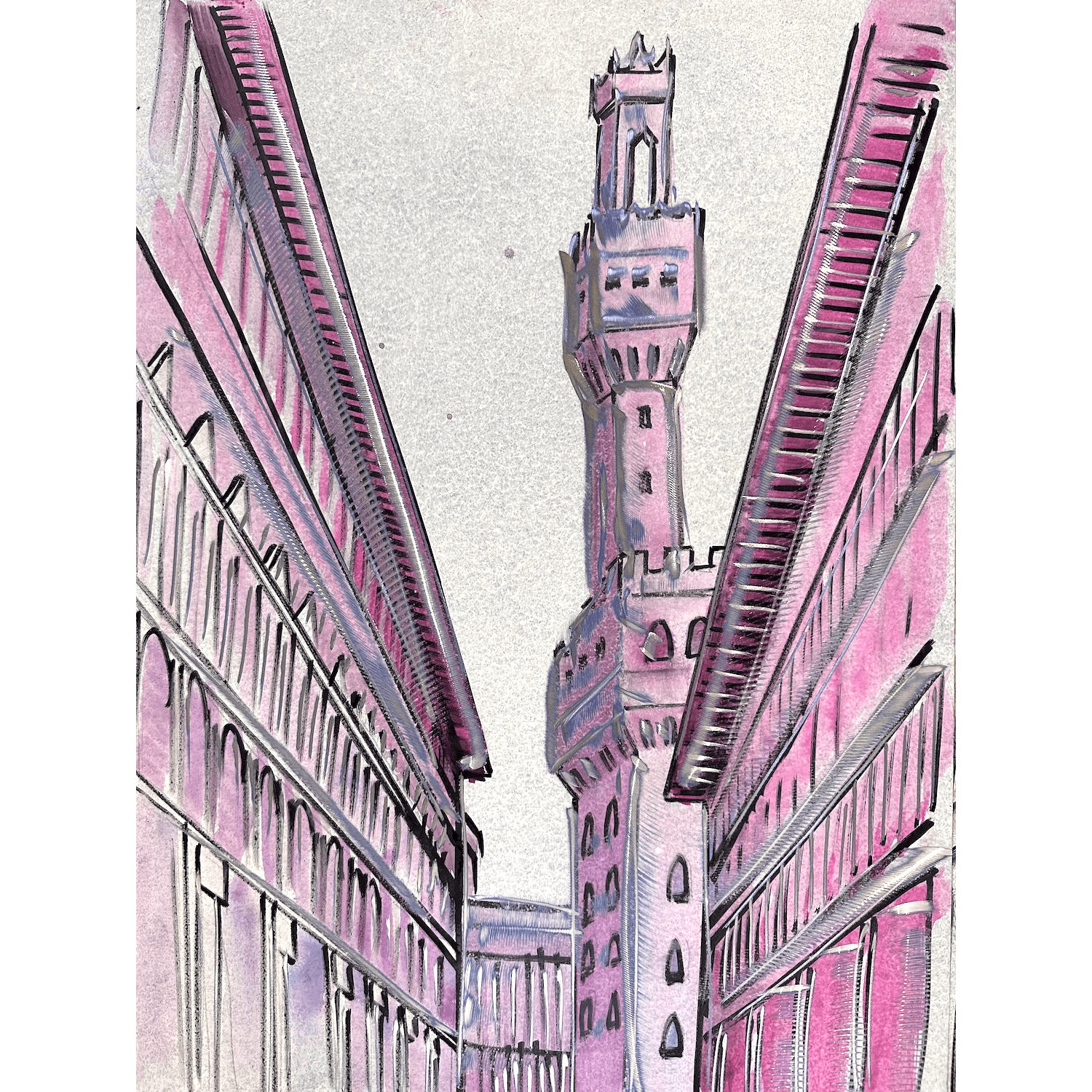 Purple Old Palace Tower is a contemporary artwork inspired by one of the most iconic symbols of Florence, where the historic tower rises between the city’s architectural lines.