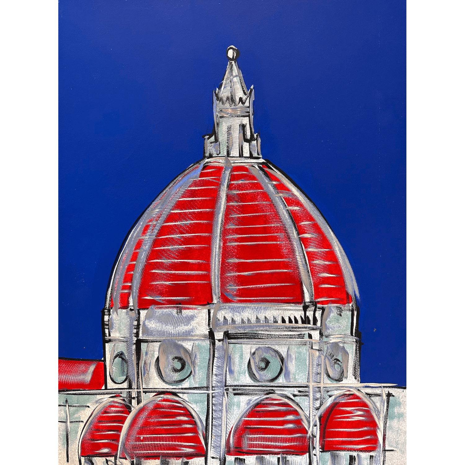 Red Dome in Blue is a contemporary artwork inspired by the Cathedral of Florence, where the iconic dome stands out in deep red against a vibrant blue background.