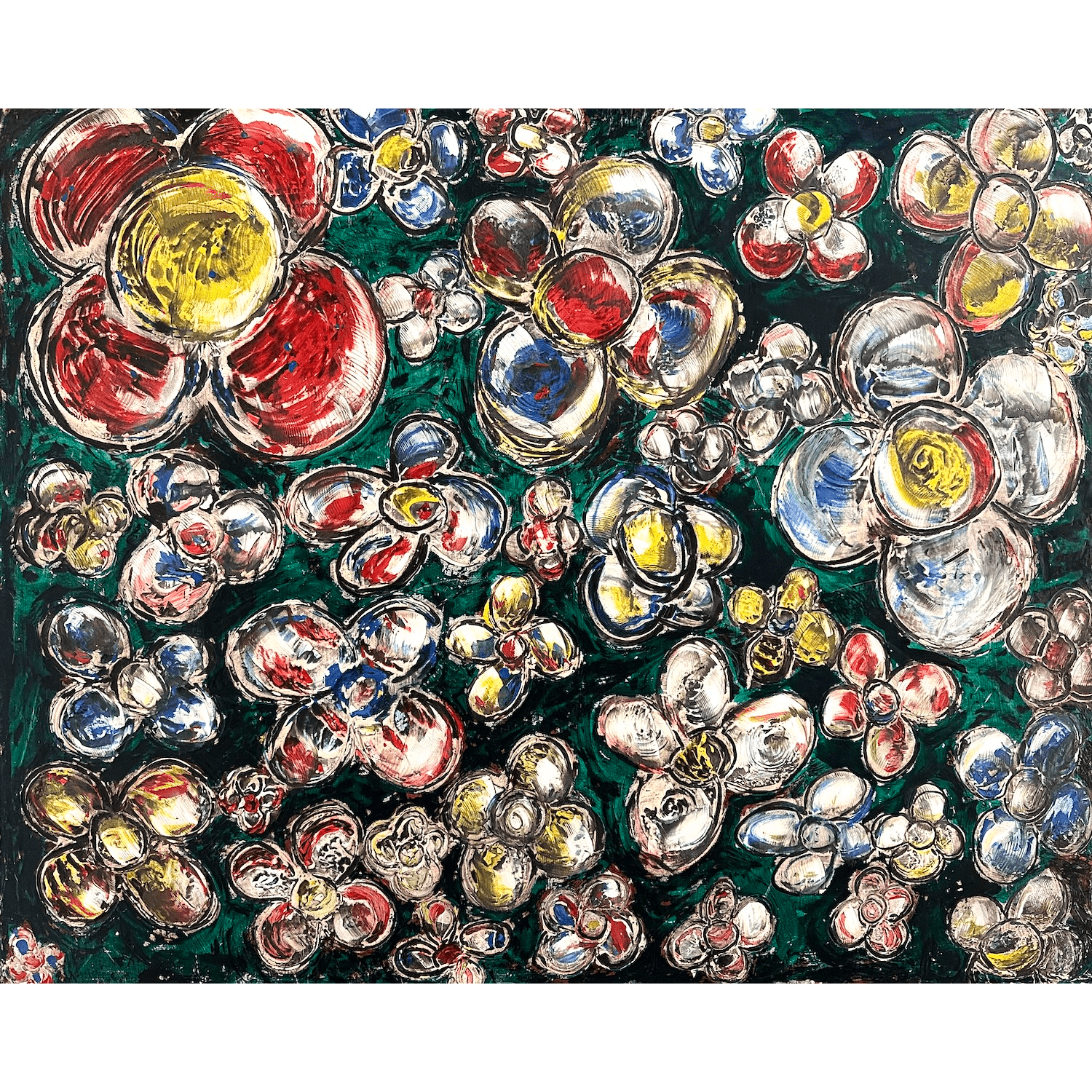 Secret Garden Blossoms is a contemporary artwork inspired by the richness of a blooming garden, where countless flowers emerge across a vibrant green background.