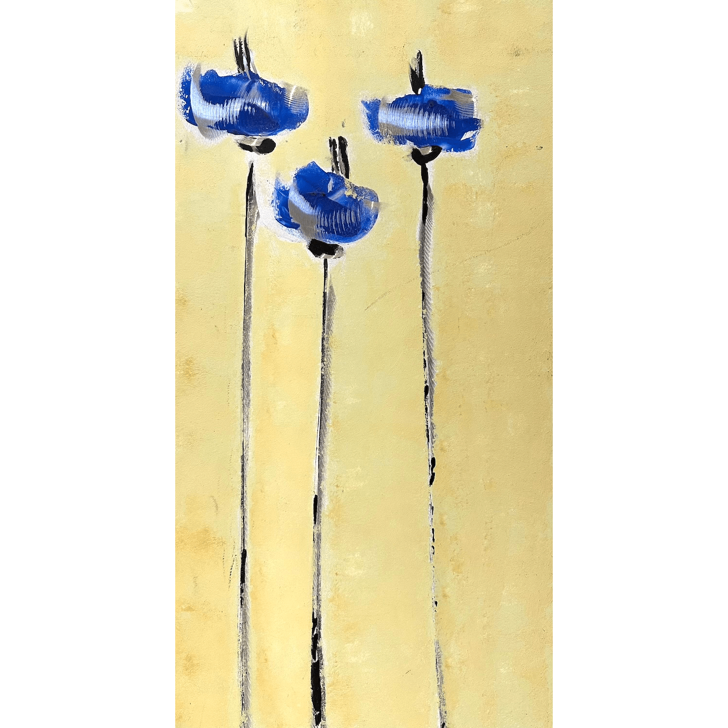Three Blue Poppies in Gold is a contemporary graffito artwork where three elegant poppies rise against a luminous golden background.
